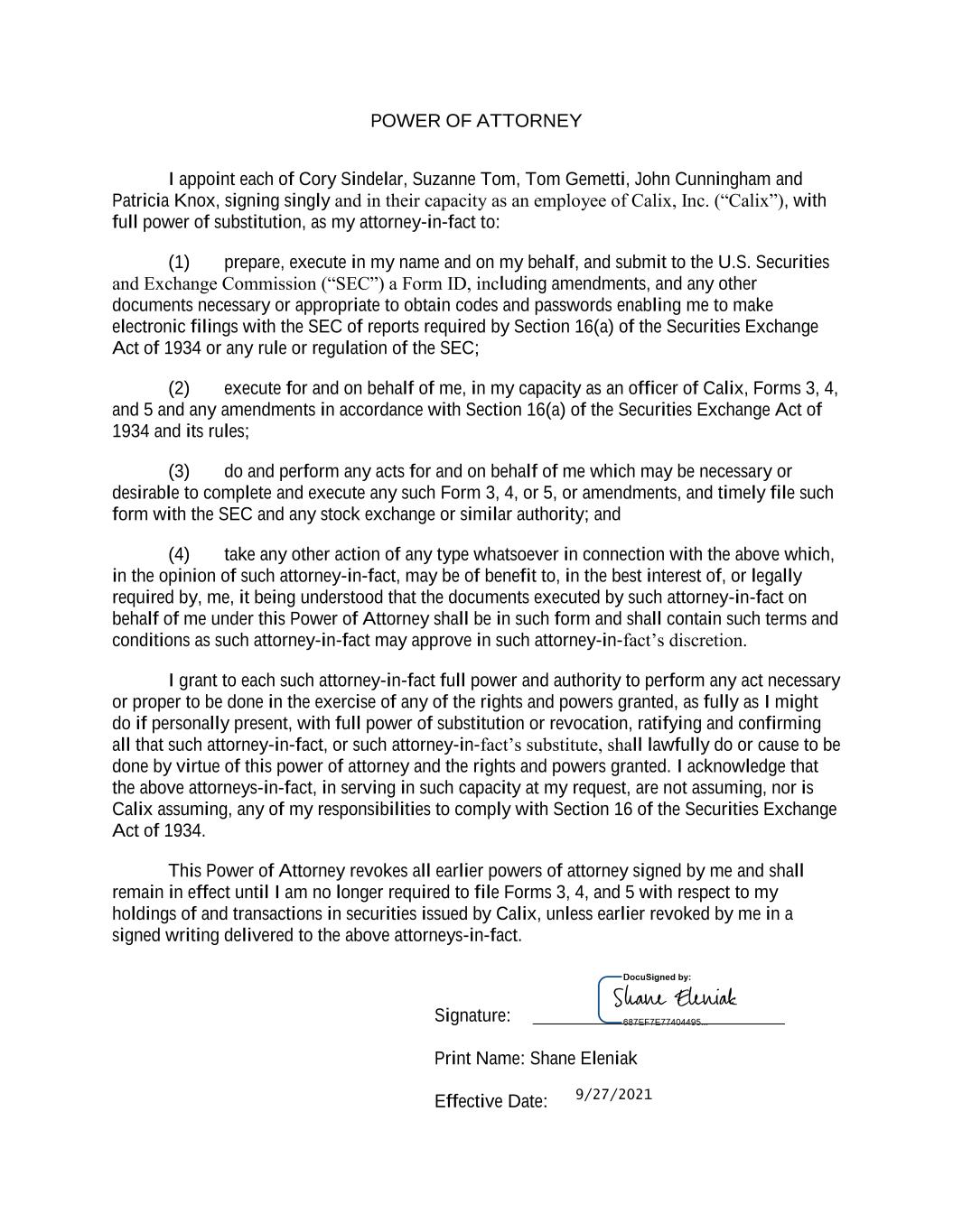 POWER OF ATTORNEY I appoint each of Cory Sindelar, Suzanne Tom, Tom Gemetti, John Cunningham and Patricia Knox, signing singly and in their capacity as an employee of Calix, Inc. (“Calix”), with full power of substitution, as my attorney-in-fact to: (1) prepare, execute in my name and on my behalf, and submit to the U.S. Securities and Exchange Commission (“SEC”) a Form ID, including amendments, and any other documents necessary or appropriate to obtain codes and passwords enabling me to make electronic filings with the SEC of reports required by Section 16(a) of the Securities Exchange Act of 1934 or any rule or regulation of the SEC; (2) execute for and on behalf of me, in my capacity as an officer of Calix, Forms 3, 4, and 5 and any amendments in accordance with Section 16(a) of the Securities Exchange Act of 1934 and its rules; (3) do and perform any acts for and on behalf of me which may be necessary or desirable to complete and execute any such Form 3, 4, or 5, or amendments, and timely file such form with the SEC and any stock exchange or similar authority; and (4) take any other action of any type whatsoever in connection with the above which, in the opinion of such attorney-in-fact, may be of benefit to, in the best interest of, or legally required by, me, it being understood that the documents executed by such attorney-in-fact on behalf of me under this Power of Attorney shall be in such form and shall contain such terms and conditions as such attorney-in-fact may approve in such attorney-in-fact’s discretion. I grant to each such attorney-in-fact full power and authority to perform any act necessary or proper to be done in the exercise of any of the rights and powers granted, as fully as I might do if personally present, with full power of substitution or revocation, ratifying and confirming all that such attorney-in-fact, or such attorney-in-fact’s substitute, shall lawfully do or cause to be done by virtue of this power of attorney and the rights and powers granted. I acknowledge that the above attorneys-in-fact, in serving in such capacity at my request, are not assuming, nor is Calix assuming, any of my responsibilities to comply with Section 16 of the Securities Exchange Act of 1934. This Power of Attorney revokes all earlier powers of attorney signed by me and shall remain in effect until I am no longer required to file Forms 3, 4, and 5 with respect to my holdings of and transactions in securities issued by Calix, unless earlier revoked by me in a signed writing delivered to the above attorneys-in-fact. Signature: Print Name: Shane Eleniak Effective Date: 9/27/2021