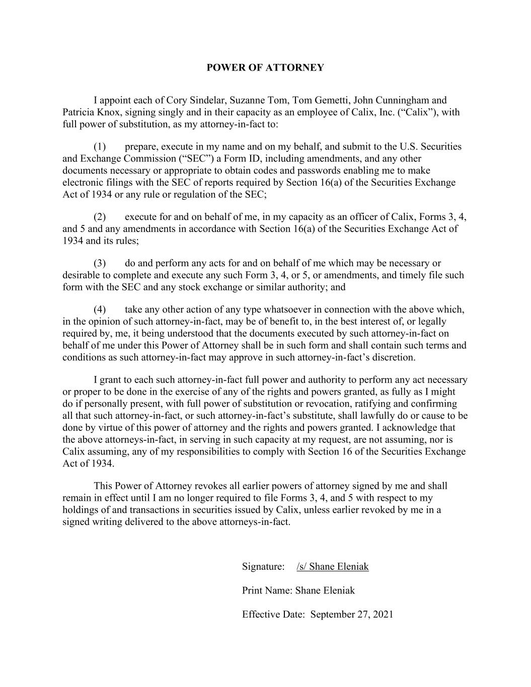 POWER OF ATTORNEY I appoint each of Cory Sindelar, Suzanne Tom, Tom Gemetti, John Cunningham and Patricia Knox, signing singly and in their capacity as an employee of Calix, Inc. (“Calix”), with full power of substitution, as my attorney-in-fact to: (1) prepare, execute in my name and on my behalf, and submit to the U.S. Securities and Exchange Commission (“SEC”) a Form ID, including amendments, and any other documents necessary or appropriate to obtain codes and passwords enabling me to make electronic filings with the SEC of reports required by Section 16(a) of the Securities Exchange Act of 1934 or any rule or regulation of the SEC; (2) execute for and on behalf of me, in my capacity as an officer of Calix, Forms 3, 4, and 5 and any amendments in accordance with Section 16(a) of the Securities Exchange Act of 1934 and its rules; (3) do and perform any acts for and on behalf of me which may be necessary or desirable to complete and execute any such Form 3, 4, or 5, or amendments, and timely file such form with the SEC and any stock exchange or similar authority; and (4) take any other action of any type whatsoever in connection with the above which, in the opinion of such attorney-in-fact, may be of benefit to, in the best interest of, or legally required by, me, it being understood that the documents executed by such attorney-in-fact on behalf of me under this Power of Attorney shall be in such form and shall contain such terms and conditions as such attorney-in-fact may approve in such attorney-in-fact’s discretion. I grant to each such attorney-in-fact full power and authority to perform any act necessary or proper to be done in the exercise of any of the rights and powers granted, as fully as I might do if personally present, with full power of substitution or revocation, ratifying and confirming all that such attorney-in-fact, or such attorney-in-fact’s substitute, shall lawfully do or cause to be done by virtue of this power of attorney and the rights and powers granted. I acknowledge that the above attorneys-in-fact, in serving in such capacity at my request, are not assuming, nor is Calix assuming, any of my responsibilities to comply with Section 16 of the Securities Exchange Act of 1934. This Power of Attorney revokes all earlier powers of attorney signed by me and shall remain in effect until I am no longer required to file Forms 3, 4, and 5 with respect to my holdings of and transactions in securities issued by Calix, unless earlier revoked by me in a signed writing delivered to the above attorneys-in-fact. Signature: /s/ Shane Eleniak Print Name: Shane Eleniak Effective Date: September 27, 2021