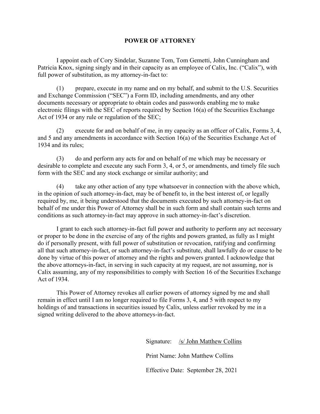 POWER OF ATTORNEY I appoint each of Cory Sindelar, Suzanne Tom, Tom Gemetti, John Cunningham and Patricia Knox, signing singly and in their capacity as an employee of Calix, Inc. (“Calix”), with full power of substitution, as my attorney-in-fact to: (1) prepare, execute in my name and on my behalf, and submit to the U.S. Securities and Exchange Commission (“SEC”) a Form ID, including amendments, and any other documents necessary or appropriate to obtain codes and passwords enabling me to make electronic filings with the SEC of reports required by Section 16(a) of the Securities Exchange Act of 1934 or any rule or regulation of the SEC; (2) execute for and on behalf of me, in my capacity as an officer of Calix, Forms 3, 4, and 5 and any amendments in accordance with Section 16(a) of the Securities Exchange Act of 1934 and its rules; (3) do and perform any acts for and on behalf of me which may be necessary or desirable to complete and execute any such Form 3, 4, or 5, or amendments, and timely file such form with the SEC and any stock exchange or similar authority; and (4) take any other action of any type whatsoever in connection with the above which, in the opinion of such attorney-in-fact, may be of benefit to, in the best interest of, or legally required by, me, it being understood that the documents executed by such attorney-in-fact on behalf of me under this Power of Attorney shall be in such form and shall contain such terms and conditions as such attorney-in-fact may approve in such attorney-in-fact’s discretion. I grant to each such attorney-in-fact full power and authority to perform any act necessary or proper to be done in the exercise of any of the rights and powers granted, as fully as I might do if personally present, with full power of substitution or revocation, ratifying and confirming all that such attorney-in-fact, or such attorney-in-fact’s substitute, shall lawfully do or cause to be done by virtue of this power of attorney and the rights and powers granted. I acknowledge that the above attorneys-in-fact, in serving in such capacity at my request, are not assuming, nor is Calix assuming, any of my responsibilities to comply with Section 16 of the Securities Exchange Act of 1934. This Power of Attorney revokes all earlier powers of attorney signed by me and shall remain in effect until I am no longer required to file Forms 3, 4, and 5 with respect to my holdings of and transactions in securities issued by Calix, unless earlier revoked by me in a signed writing delivered to the above attorneys-in-fact. Signature: /s/ John Matthew Collins Print Name: John Matthew Collins Effective Date: September 28, 2021