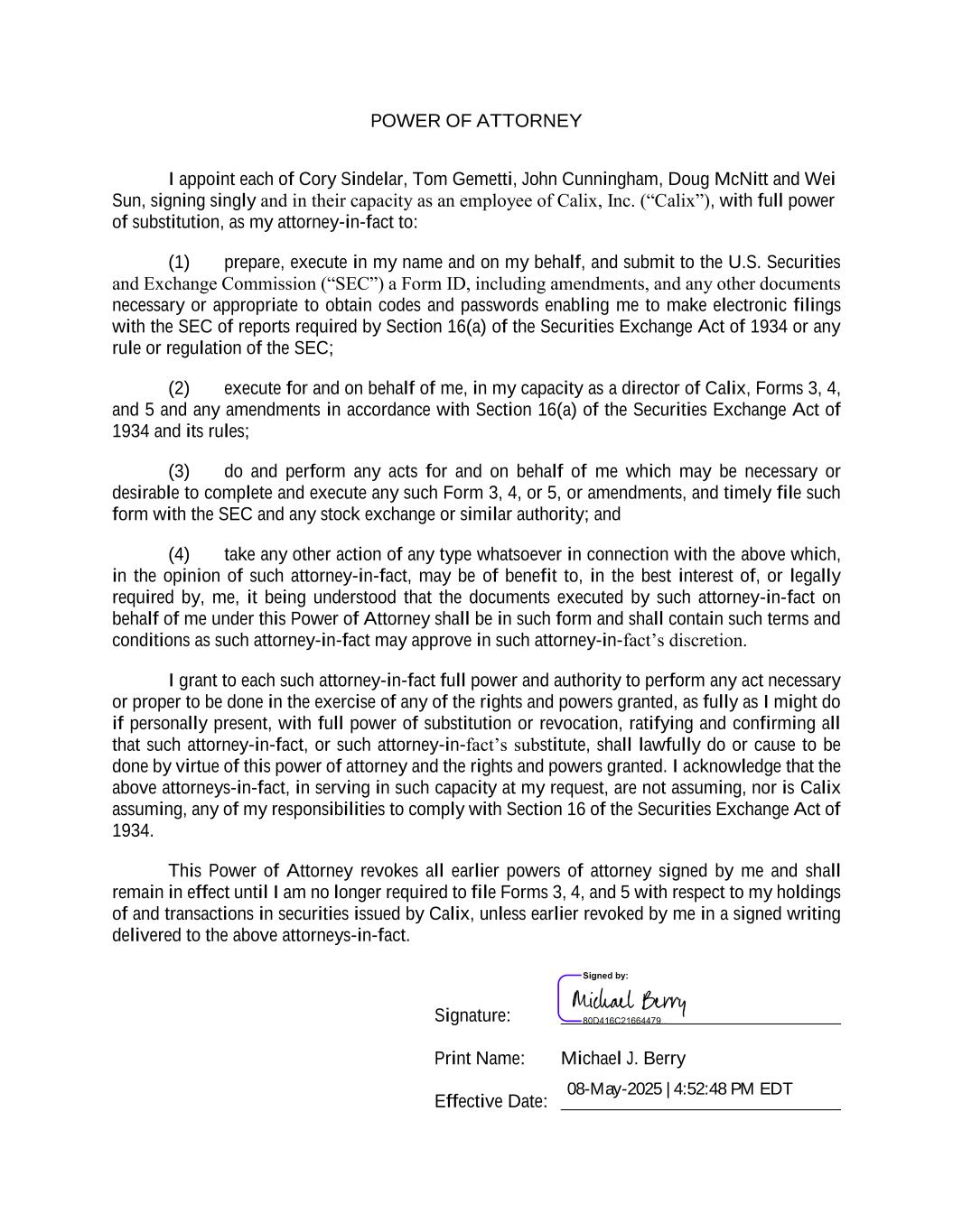 POWER OF ATTORNEY I appoint each of Cory Sindelar, Tom Gemetti, John Cunningham, Doug McNitt and Wei Sun, signing singly and in their capacity as an employee of Calix, Inc. (“Calix”), with full power of substitution, as my attorney-in-fact to: (1) prepare, execute in my name and on my behalf, and submit to the U.S. Securities and Exchange Commission (“SEC”) a Form ID, including amendments, and any other documents necessary or appropriate to obtain codes and passwords enabling me to make electronic filings with the SEC of reports required by Section 16(a) of the Securities Exchange Act of 1934 or any rule or regulation of the SEC; (2) execute for and on behalf of me, in my capacity as a director of Calix, Forms 3, 4, and 5 and any amendments in accordance with Section 16(a) of the Securities Exchange Act of 1934 and its rules; (3) do and perform any acts for and on behalf of me which may be necessary or desirable to complete and execute any such Form 3, 4, or 5, or amendments, and timely file such form with the SEC and any stock exchange or similar authority; and (4) take any other action of any type whatsoever in connection with the above which, in the opinion of such attorney-in-fact, may be of benefit to, in the best interest of, or legally required by, me, it being understood that the documents executed by such attorney-in-fact on behalf of me under this Power of Attorney shall be in such form and shall contain such terms and conditions as such attorney-in-fact may approve in such attorney-in-fact’s discretion. I grant to each such attorney-in-fact full power and authority to perform any act necessary or proper to be done in the exercise of any of the rights and powers granted, as fully as I might do if personally present, with full power of substitution or revocation, ratifying and confirming all that such attorney-in-fact, or such attorney-in-fact’s substitute, shall lawfully do or cause to be done by virtue of this power of attorney and the rights and powers granted. I acknowledge that the above attorneys-in-fact, in serving in such capacity at my request, are not assuming, nor is Calix assuming, any of my responsibilities to comply with Section 16 of the Securities Exchange Act of 1934. This Power of Attorney revokes all earlier powers of attorney signed by me and shall remain in effect until I am no longer required to file Forms 3, 4, and 5 with respect to my holdings of and transactions in securities issued by Calix, unless earlier revoked by me in a signed writing delivered to the above attorneys-in-fact. Signature: Print Name: Michael J. Berry Effective Date: 08-May-2025 | 4:52:48 PM EDT
